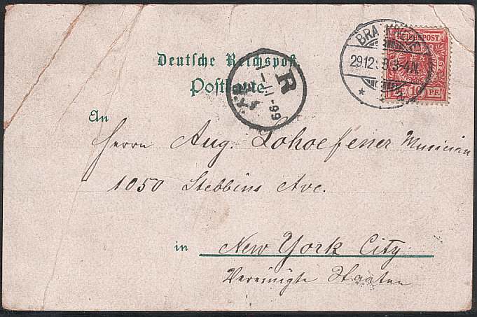 Vorder- und Rückseite einer Karte von 1898 nach New York. Aus heutiger Sicht kann einem der damalige amerikanische Postbote sowie der Empfänger etwas leid tun. Oder können Sie die Schrift lesen?
