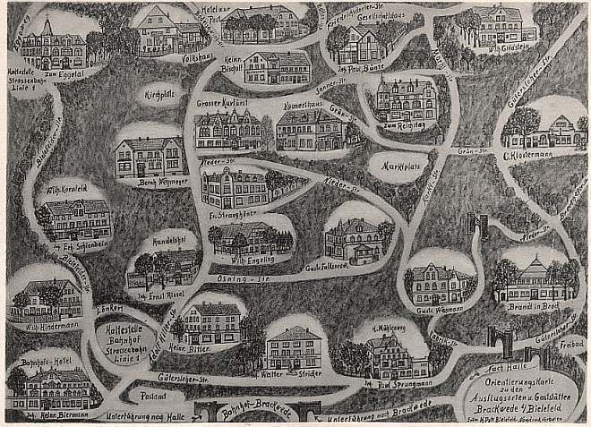 Eine Orientierungskarte von 1936 zu den Gaststätten in Brackwede. Diese könnte praktischer Begleiter u.a. bei Junggesellenabschieden gewesen sein.