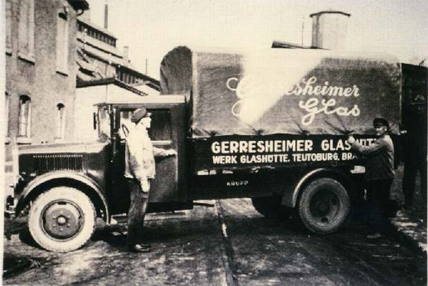 Ein LKW der Fa. Gerresheimer Glashütte (Glashütte Teutoburg, Brackwede) von ca. 1930. Dabei handelt